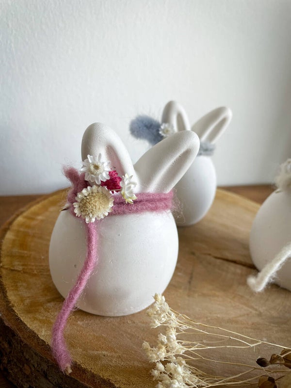 Der Hase kann auf Grund der Handfertigung kleine Abweichungen vom Original Foto aufweisen. Aufgrund der Beschaffenheit des Betons/Gipsgemisches können Unregelmäßigkeiten, wie zum Beispiel kleine Bläschen auftreten. Die Trockenblumen ändern je nach Verfügbarkeit, werden jedoch immer passend zur Bandfarbe gewählt.